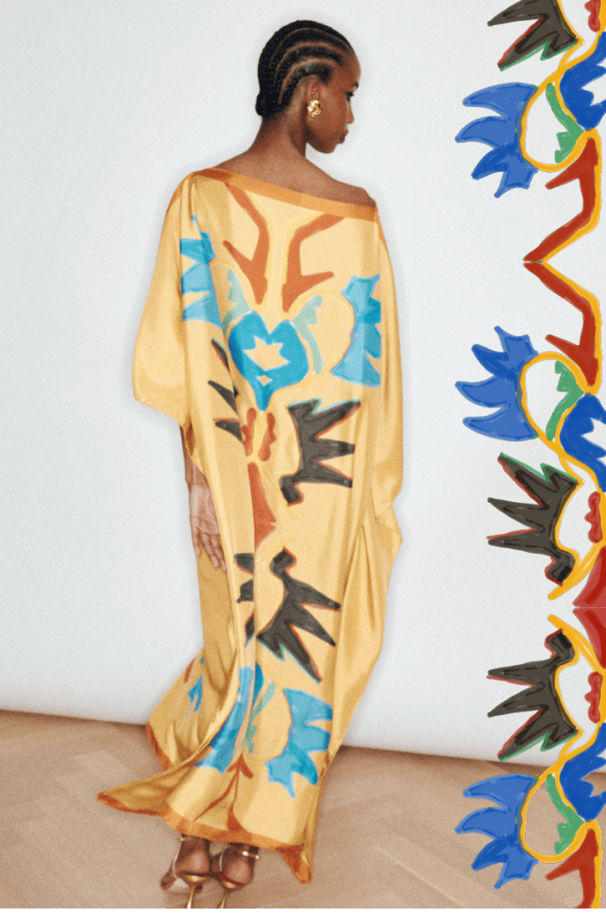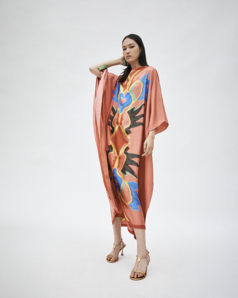 Im Zentrum steht ein Kaftan aus Seide, der klassische Motive aufgreift und sie in eine zeitgenössische Form überführt. Die fließende Silhouette, der tiefe Ausschnitt und die Leichtigkeit des Materials erzeugen eine Präsenz, die weniger laut als selbstverständlich wirkt. Farben scheinen sich über die Oberfläche zu bewegen, Muster entwickeln eine fast malerische Qualität, ohne je ins Dekorative zu kippen. Das Kleidungsstück funktioniert dabei nicht als Statement im klassischen Sinn, sondern als eine Art Haltung – selbstbewusst, aber nicht inszeniert. Ergänzt wird diese Idee durch ein Tuch, das sich bewusst jeder eindeutigen Funktion entzieht. Gefertigt aus leichter Wolle und mit feinen Stickereien versehen, eröffnet es verschiedene Möglichkeiten des Tragens: als Stola, als Rock, als Kleid. Es geht weniger um Transformation als um Freiheit im Umgang mit dem eigenen Stil. Die Beweglichkeit des Materials wird zum gestalterischen Element, das sich immer wieder neu interpretieren lässt.