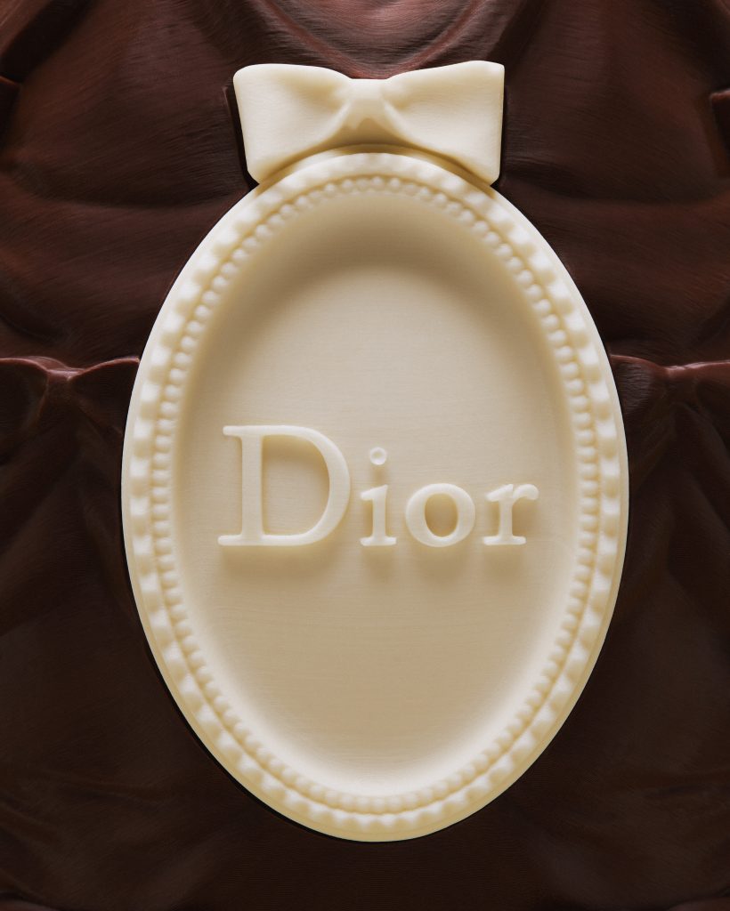 Im Zentrum steht ein Ei von außergewöhnlicher Dimension, gefertigt aus dunkler und weißer Schokolade. Doch es ist weit mehr als ein saisonales Pâtisserie-Stück. Die Form zitiert eines der zentralen Embleme von Christian Dior: das Medaillon, akzentuiert von einer fein modellierten Schleife. Dieses Motiv, das seit Jahrzehnten für die formale Eleganz des Hauses steht, wird hier in essbarer Skulptur interpretiert. Die Oberfläche wirkt wie ein Couture-Relief – präzise gearbeitet, mit jener leisen Opulenz, die Dior seit 1947 auszeichnet.