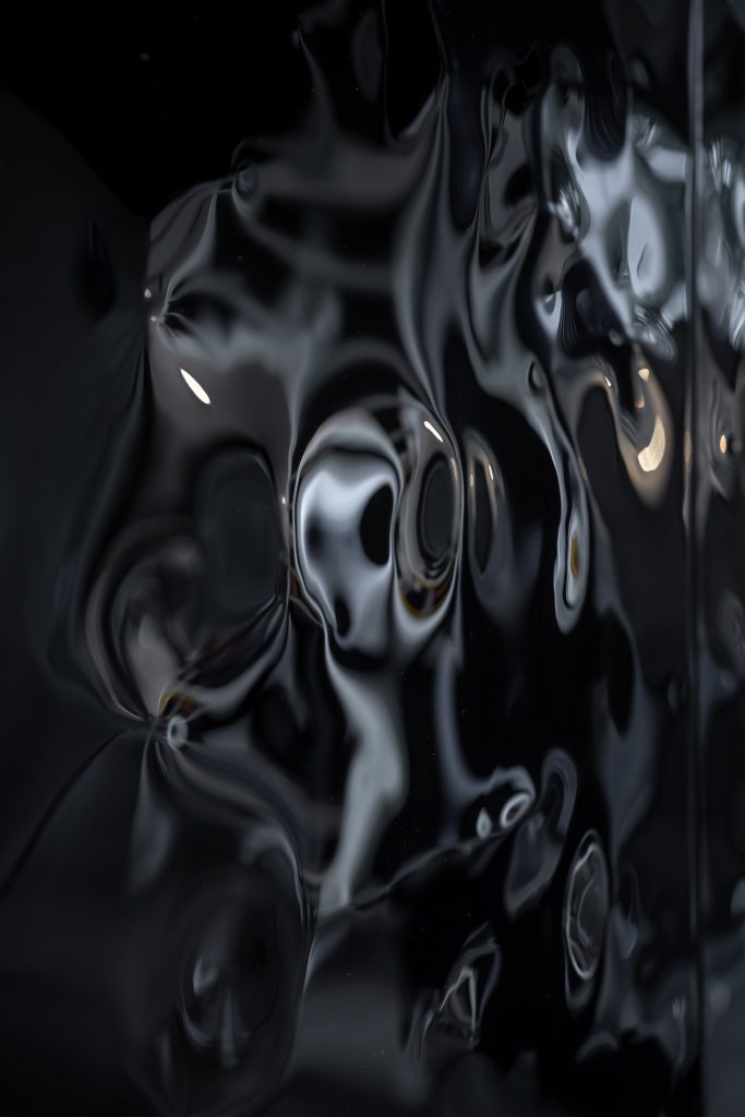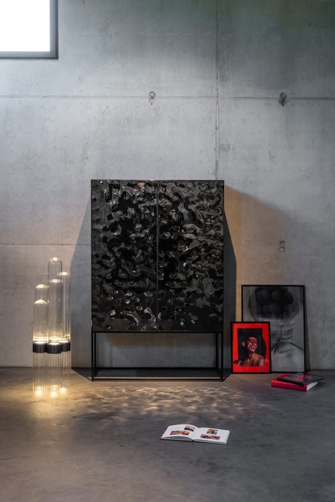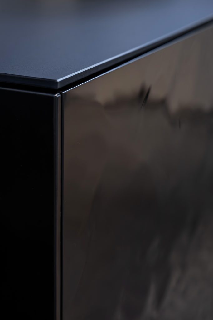Die Ausführung Champagne zeigt die Struktur in einem hellen, schimmernden Goldton. Reflexe bewegen sich sanft über die Oberfläche und verleihen dem Möbel eine ruhige, elegante Ausstrahlung. Das Licht wirkt weich und gleichmäßig, wodurch Sideboards oder Stauraummöbel eine fast schwebende Präsenz im Raum erhalten. Mit Bronze erhält die Oberfläche eine wärmere, tiefere Anmutung. Der Ton besitzt einen feinen Rosé-Schimmer und verbindet die Leichtigkeit von Champagne mit der stärkeren Materialwirkung von Onyx. Das Relief tritt etwas deutlicher hervor, die Lichtreflexe erscheinen präziser. Möbel in dieser Ausführung wirken ruhig, aber zugleich charakterstark. Die Variante Onyx interpretiert WAVE schließlich in einer tiefschwarzen, fast schwarzchromartigen Oberfläche. Hier verdichtet sich das Zusammenspiel von Licht und Struktur besonders intensiv. Die Reliefstruktur wird klarer sichtbar, Reflexe erscheinen kontrastreicher und verleihen dem Möbel eine markante architektonische Wirkung.